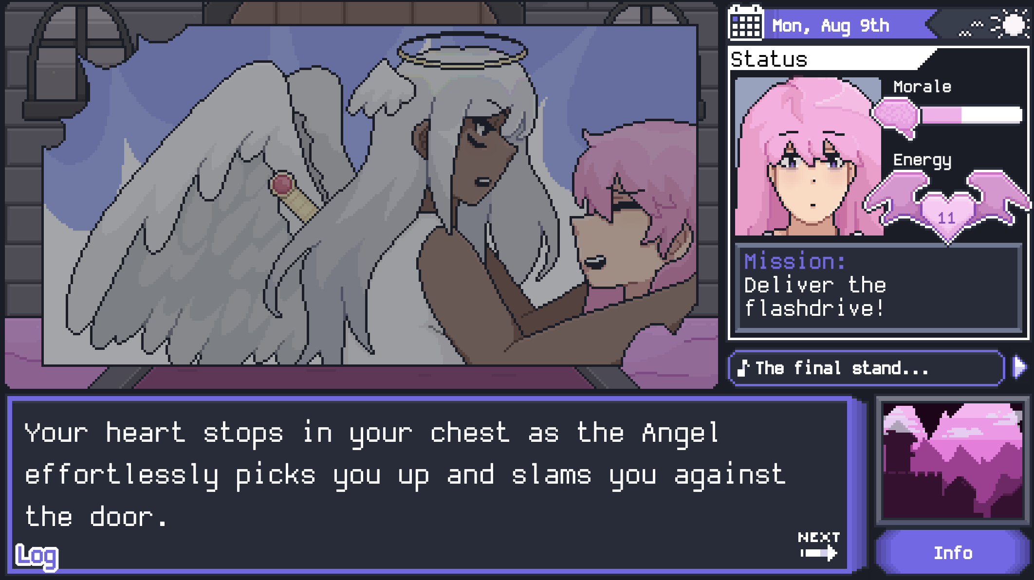 In this chapter, an angel tries to kill you (again) and the fate of demonkind still rests on your shoulders. No pressure!